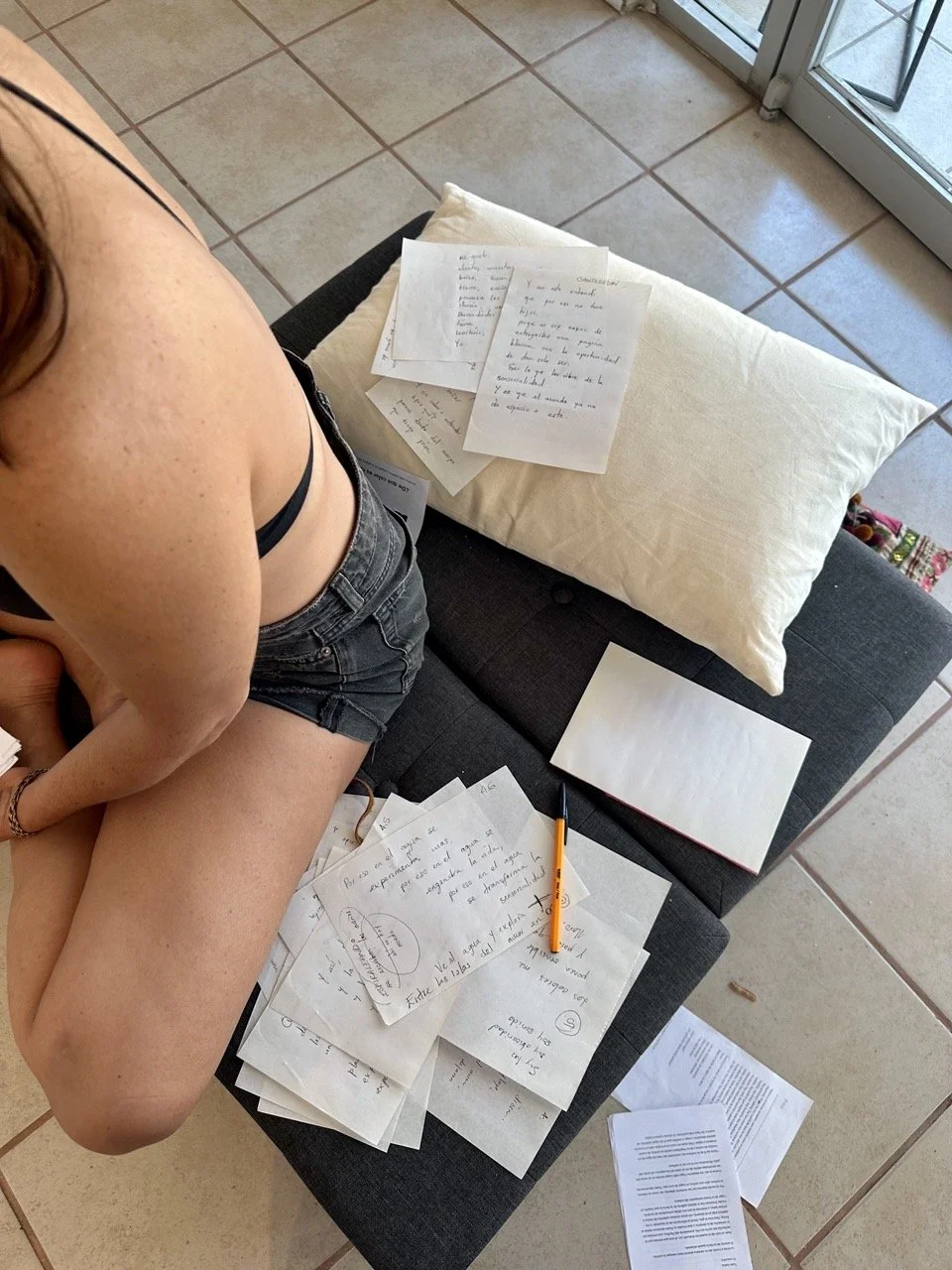The installation creates an environment where boundaries blur, where inner and outer landscapes merge, and where writing becomes a portal to listen, receive, and respond.